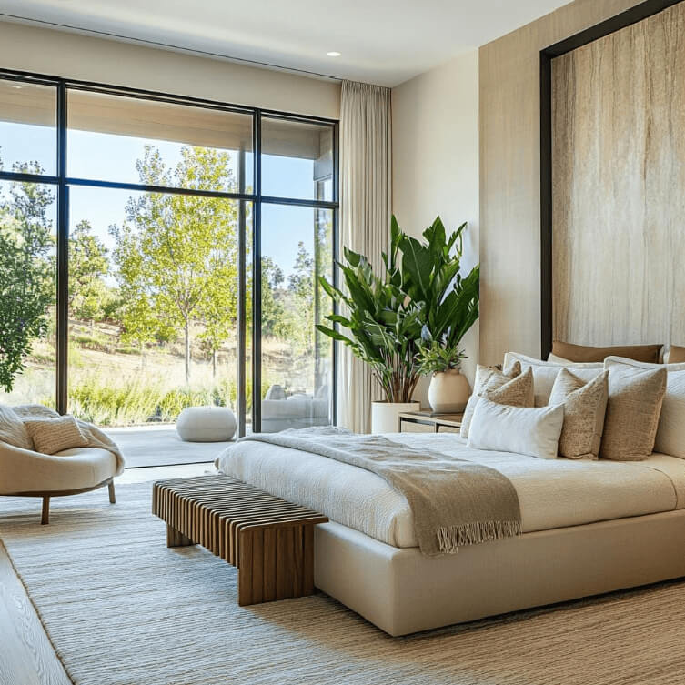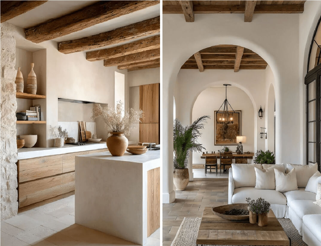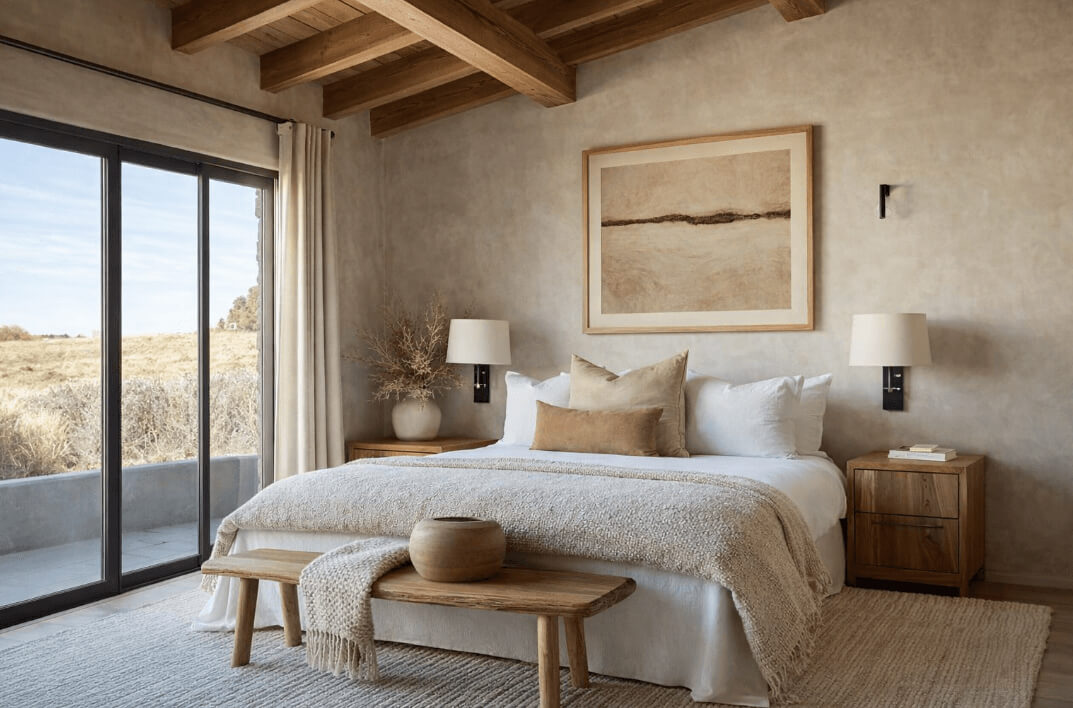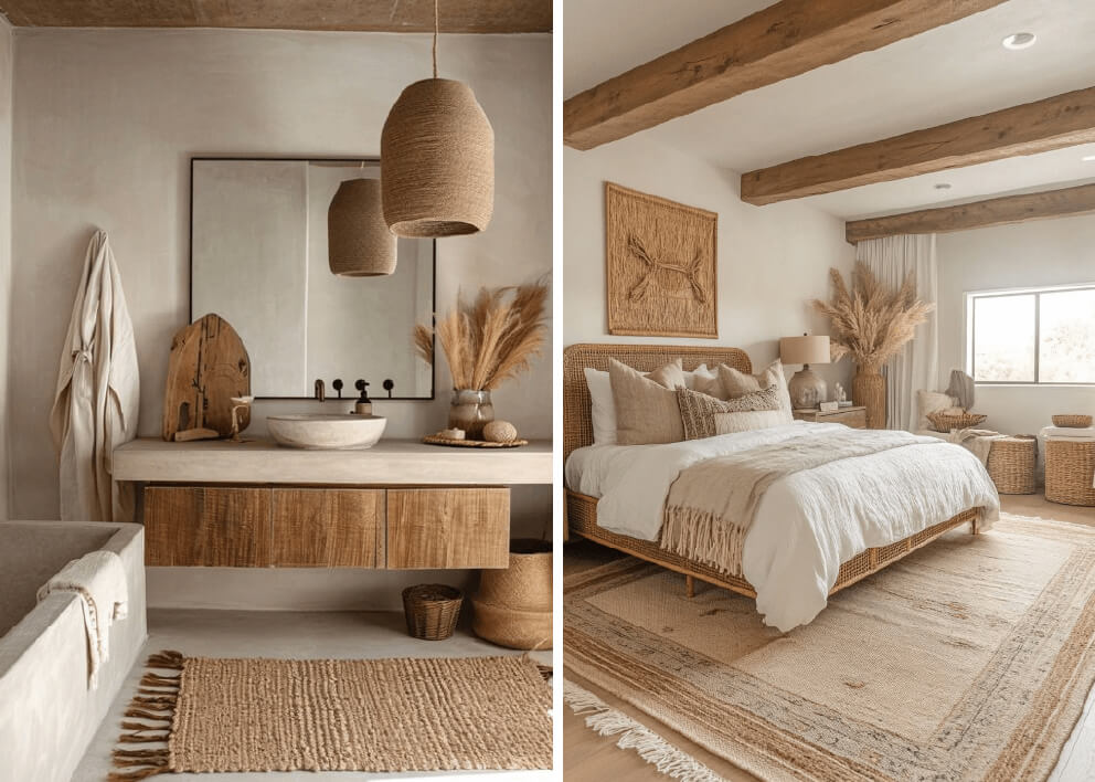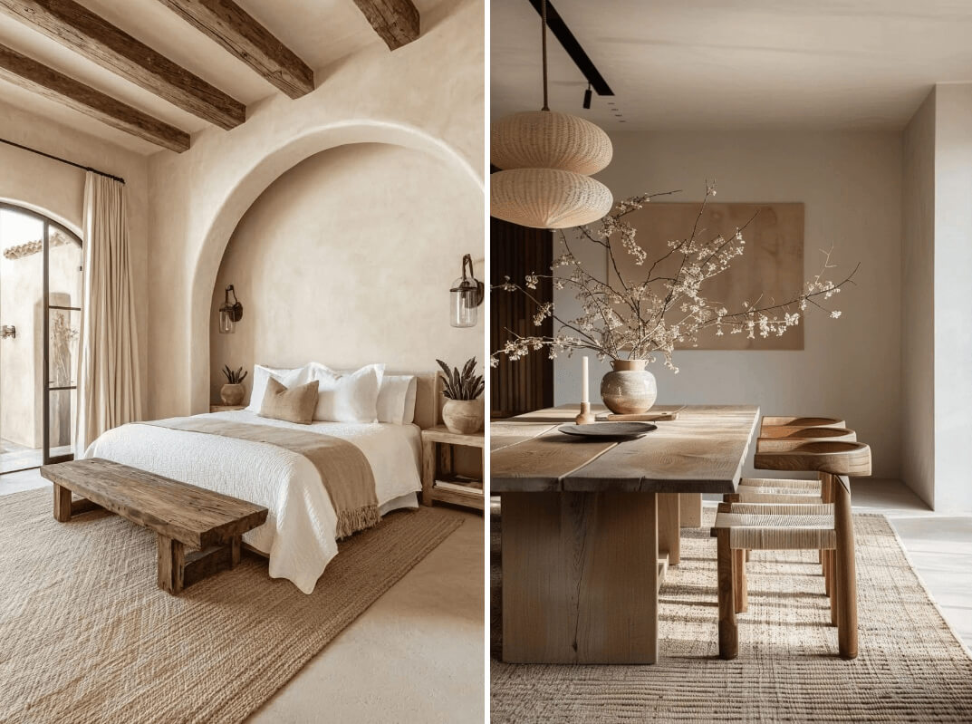 Tonos tierra, arena, ocres, beige y marrones dominan la escena, con acentos en verde oliva, terracota o gris piedra. Los colores acompañan a los materiales y refuerzan la sensación de equilibrio, conexión con lo natural y serenidad visual.
