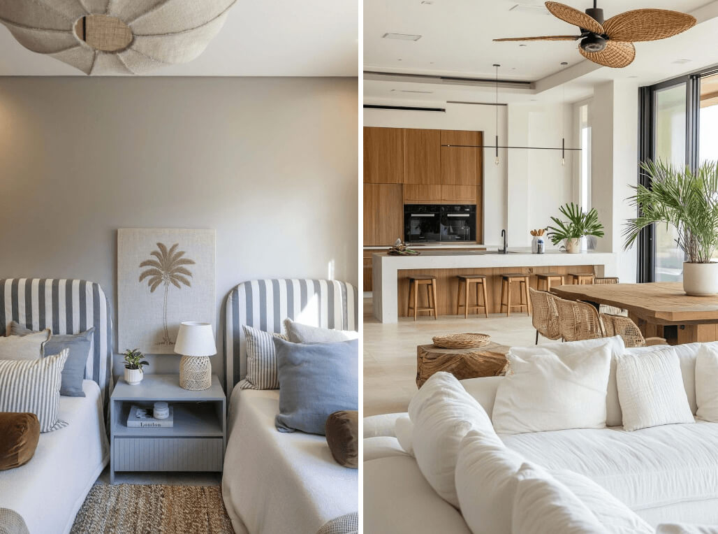 Blanco, arena y beige claro conforman la base cromática, combinándose con acentos suaves como azul cielo, verde agua o gris claro. La sensación es de frescura, continuidad y amplitud visual, con colores que reflejan la calma del entorno marítimo.