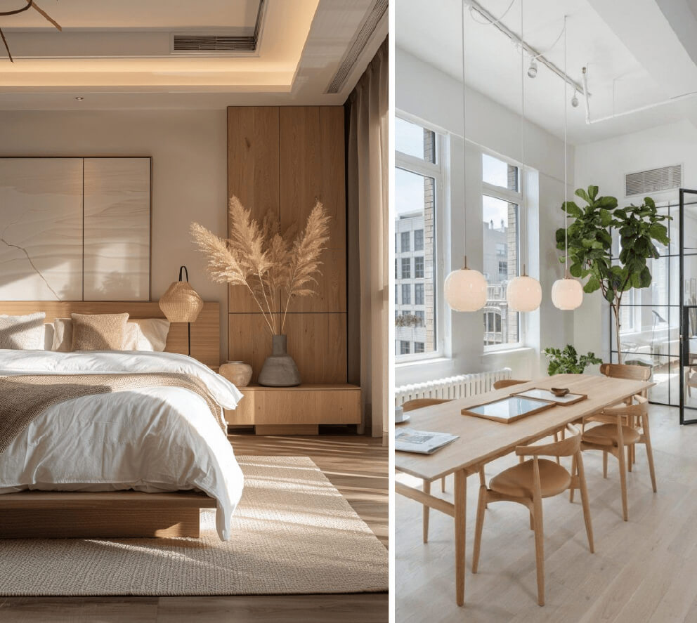 Las maderas claras (roble, pino, abedul) son protagonistas, acompañadas por textiles naturales como lino, algodón y lana.