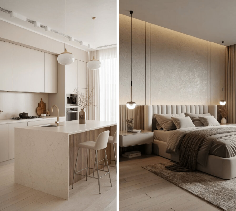 Predominan los blancos, grises claros y beige muy suaves, pensados para reflejar la luz natural.