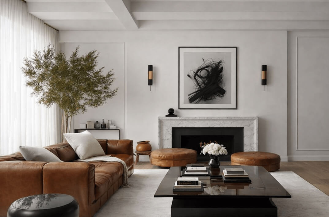 La paleta moderna es contenida y contrastada. Blanco, negro y grises fríos dominan el espacio, generando una sensación de claridad y estructura.