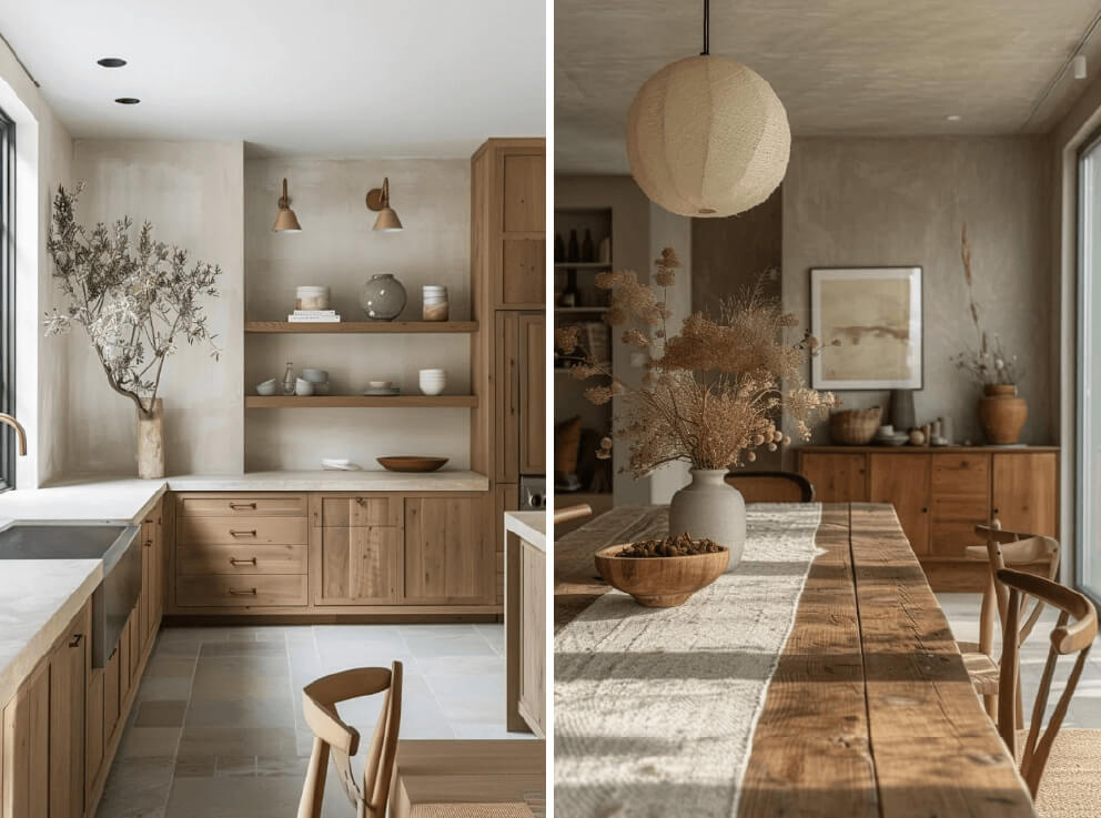 Predominan la madera, cerámica artesanal, piedra, fibras naturales y textiles nobles como lino o algodón. Las texturas son suaves, honestas y táctiles. Cada elemento suma presencia desde la sutileza, evitando excesos o brillos que distraigan del conjunto.