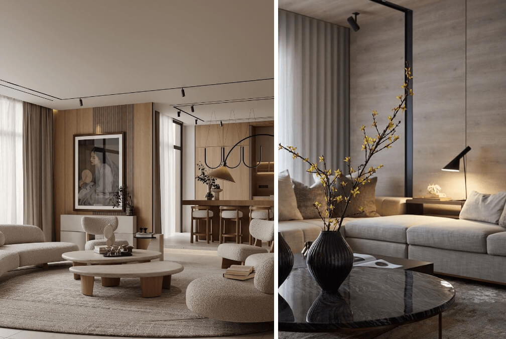 La paleta es natural y contenida. Blanco roto, beige, gris cálido y tonos arena generan una base neutra, acompañada por negro, verde oscuro o madera tostada. La sensación general es de serenidad, profundidad visual y atmósfera introspectiva y serena.
